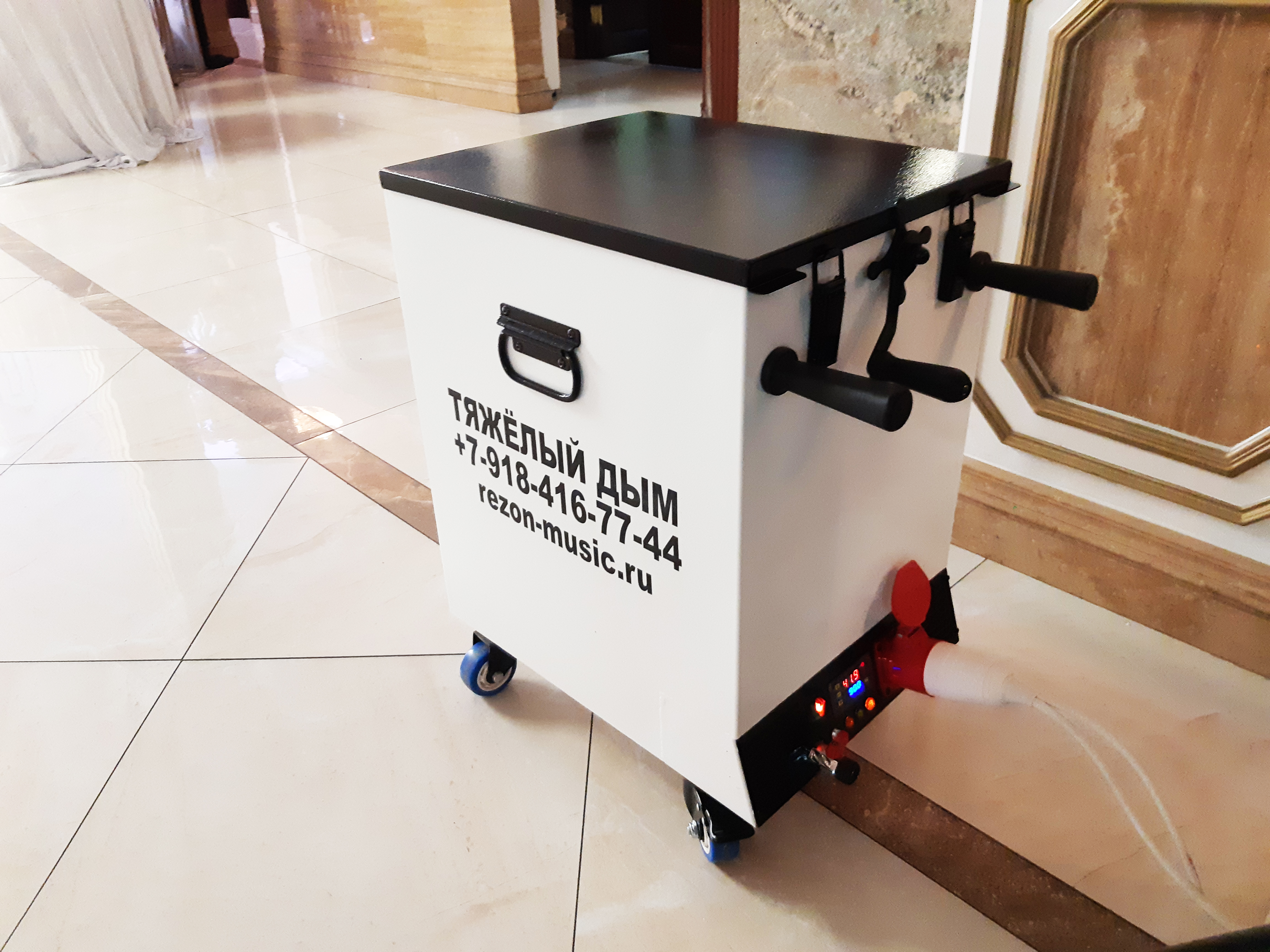 Мы используем лучшее сертифицированное оборудование - мощный генератор тяжёлого дыма с загрузкой сухого льда до 30 кг (отлично подойдёт как для маленьких, так и для больших залов).
