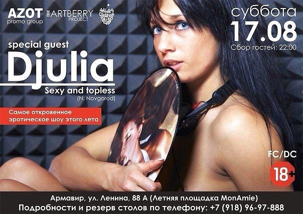 17 августа (суббота) Самое откровенное шоу этого лета! В гостях topless Djulia (N.Novgorod) "одна из лучших strip dj Европы", Dj Max Рыжков, DMC AlexPuls, go go dance, фото и видео-отчет, Сбор гостей в 22:00!